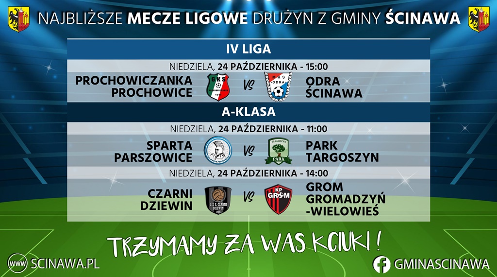 W niedzielę 24 października kolejne ligowe spotkania rozegrają zespoły z gminy Ścinawa. W IV lidze Odra Ścinawa zagra na wyjeździe z Prochowiczanką, a wiele emocji dostarczy derbowy pojedynek pomiędzy Czarnymi Dziewin a Gromem Gromadzyń-Wielowieś.