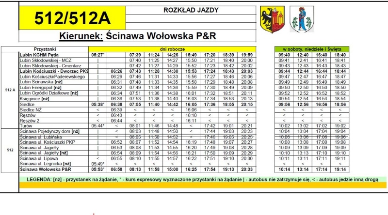 W związku z wprowadzeniem objazdu, wynikającego z realizacji robót drogowych prowadzonych na zlecenie Dolnośląskiej Służby Dróg i Kolei we Wrocławiu w ramach inwestycji pn. „Przebudowa wraz z rozbudową drogi wojewódzkiej nr 292 na odcinku Ścinawa- Lasowice”, tymczasowo wyłączony z użytkowania zostaje przystanek przy ulicy Lubińskiej w Ścinawie – dotyczy tylko kursów powrotnych relacji Lubin-Ścinawa. Na czas objazdu pasażerowie, którzy wysiadali w tej części miasta, będą musieli korzystać z przystanku zastępczego przy ulicy Kościuszki, bliżej stacji PKP. Pozostałe kursy oraz miejsca zatrzymywania się autobusów pozostają bez zmian.