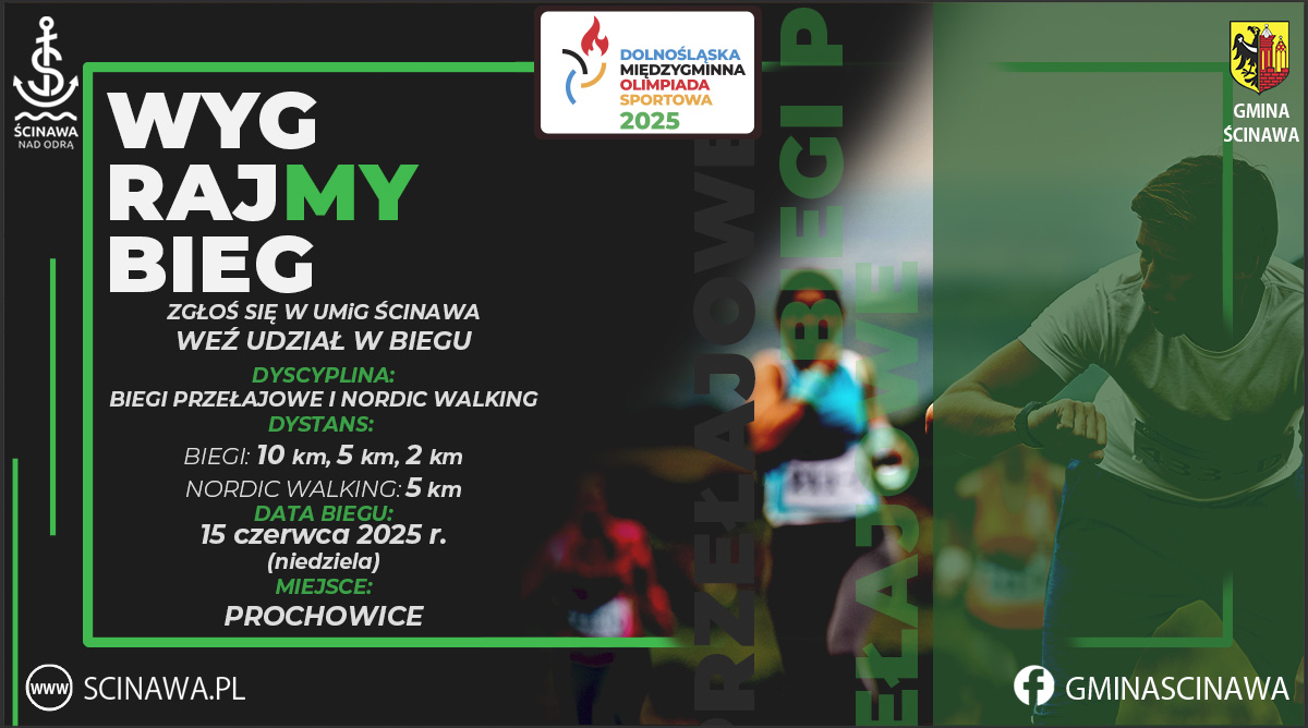 Wciąż można zapisać się do udziału w zawodach w ramach Dolnośląskiej Międzygminnej Olimpiady Sportowej, kolejny etap odbędzie się już w najbliższą niedzielę, 15 czerwca u naszych sąsiadów w Prochowicach. Zapisy są nadal otwarte! O godzinie 10:00 wystartują biegi przełajowe na dystansie 10 km, przeznaczone dla dorosłych uczestników, z kolei o 10:30 rozpocznie się bieg na 5 km, również dla dorosłych. Kilka minut później, o 10:35, na trasę ruszą uczniowie szkół podstawowych, którzy zmierzą się z dystansem 2 km. Na zakończenie, o 10:45, odbędzie się start nordic walking na trasie 5 km – w tej konkurencji udział mogą wziąć zarówno uczniowie szkół podstawowych, jak i dorośli. Serdecznie zapraszamy do zgłoszeń i udziału – to nie tylko sportowa rywalizacja, ale również doskonała okazja do integracji i wspólnej zabawy!
