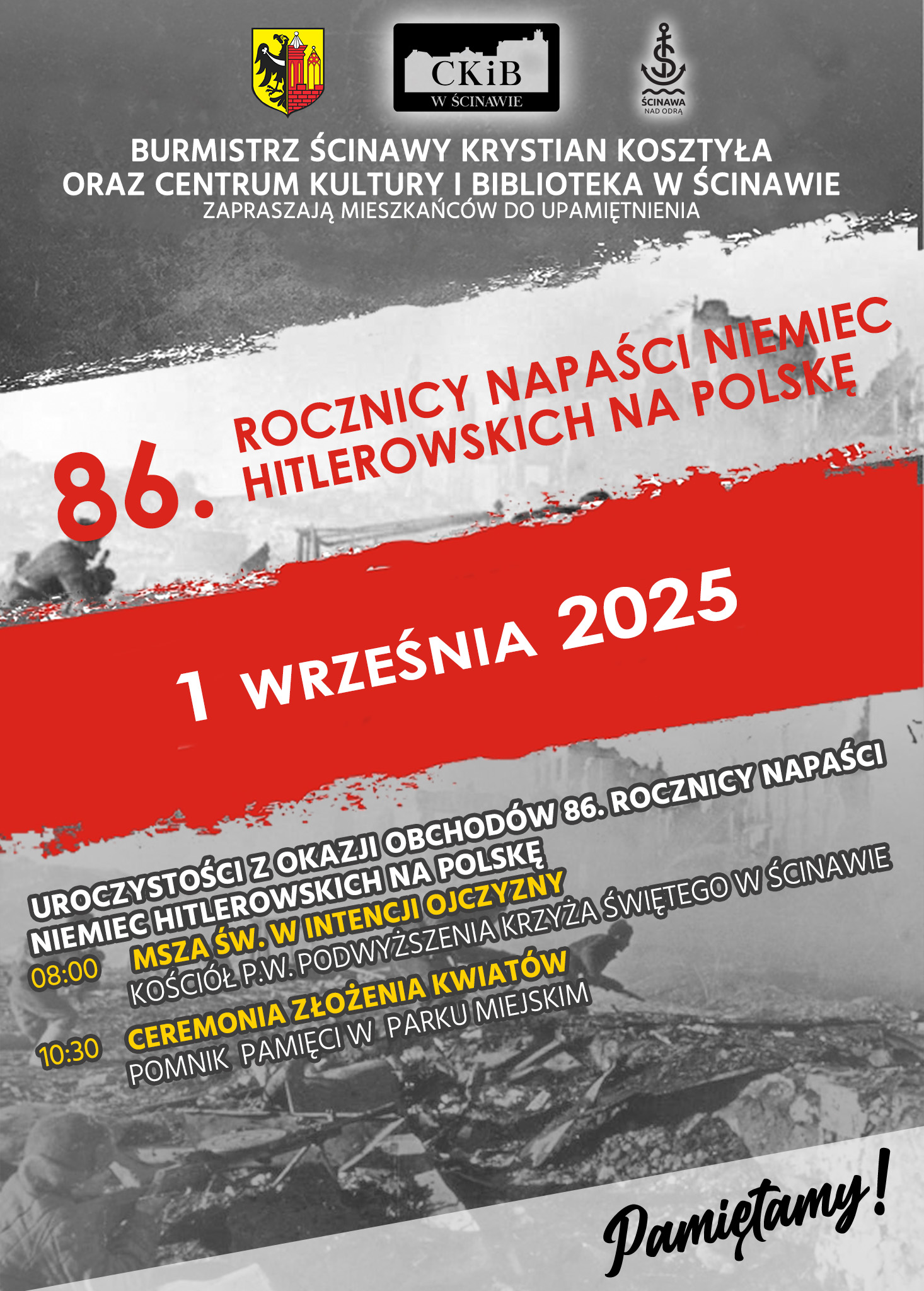 Zbliża się 86. rocznica wybuchu II wojny światowej, jednej z najtragiczniejszych kart w historii Polski i świata. Z tej okazji burmistrz Krystian Kosztyła oraz Centrum Kultury i Biblioteka w Ścinawie zapraszają mieszkańców do udziału w uroczystościach upamiętniających ofiary tego konfliktu. Obchody odbędą się w najbliższy poniedziałek, 1 września. Rozpoczną się mszą świętą w intencji Ojczyzny oraz poległych w II wojnie światowej o godz. 8:00 w kościele pw. Podwyższenia Krzyża Świętego w  Ścinawie, podczas której będziemy się również modlić za uczniów i nauczycieli u progu nowego roku szkolnego 2025/2026. Następnie, o godz. 10:30, pod pomnikiem pamięci w parku miejskim odbędzie się ceremonia złożenia kwiatów i zapalenia zniczy, połączona z okolicznościowym programem artystycznym.