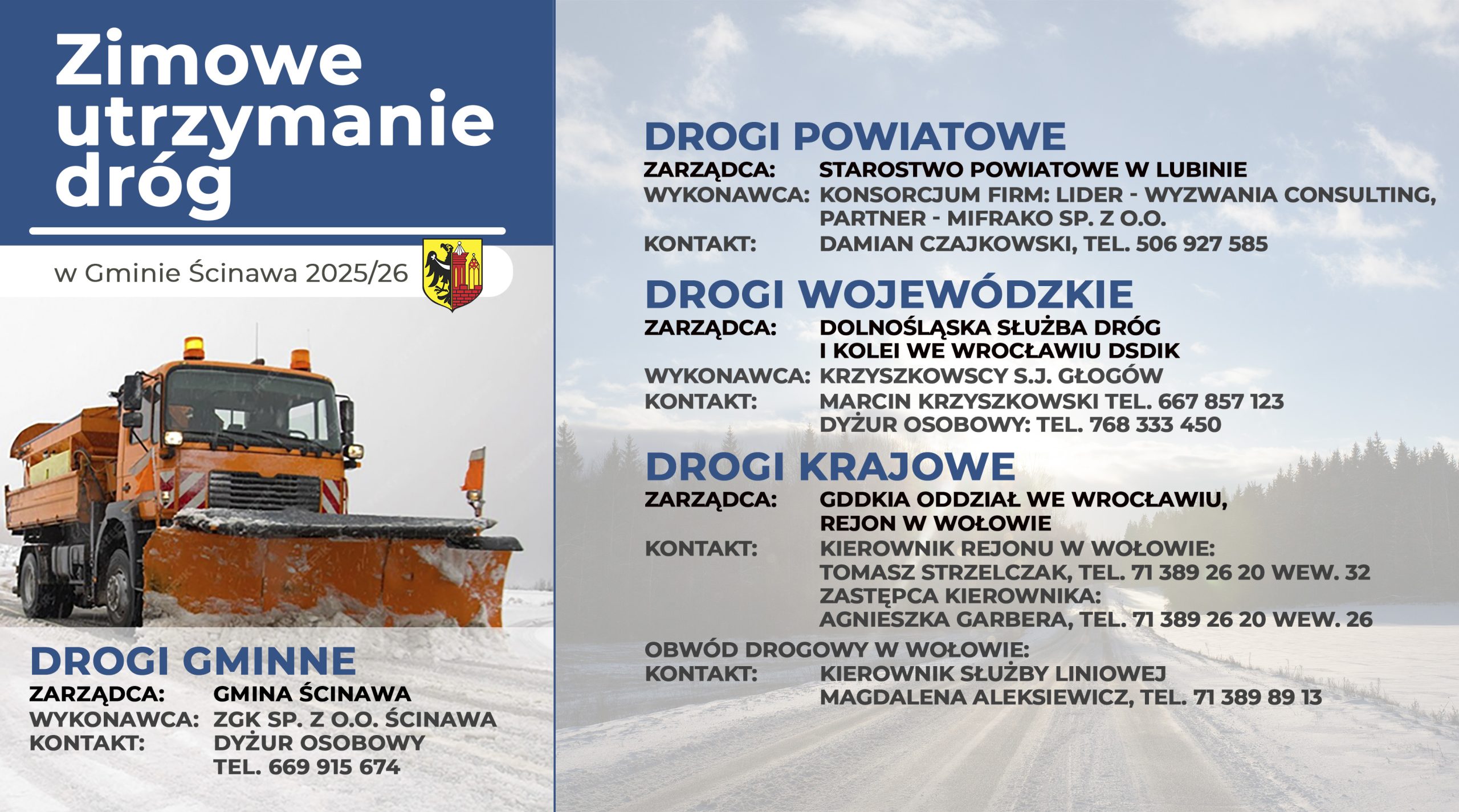 Prosimy o zgłaszanie problemów bezpośrednio do właściwych jednostek i firm, zgodnie z podziałem odpowiedzialność, co pozwoli na sprawniejsze i szybsze reagowanie służb utrzymaniowych.