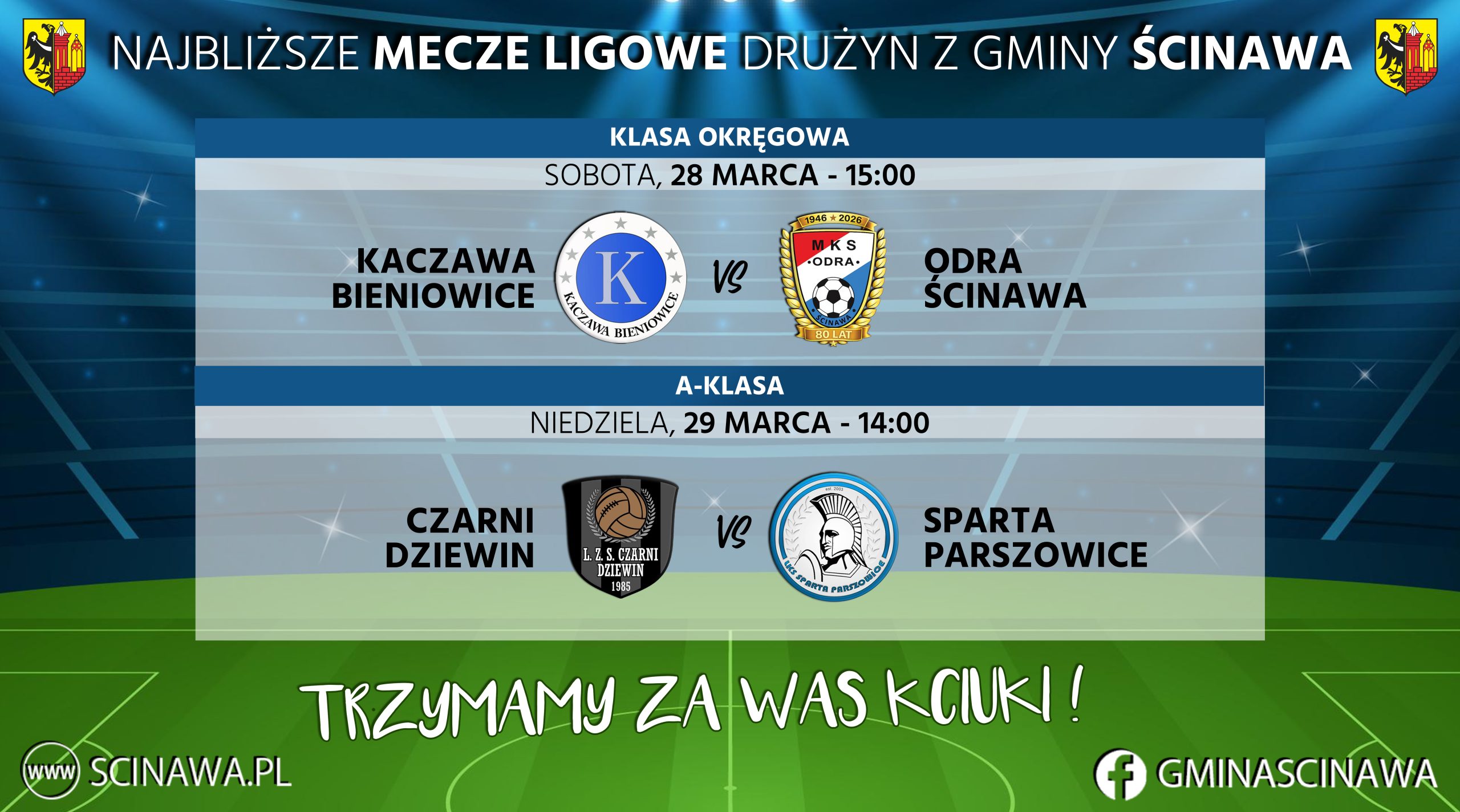 Przed nami kolejne dni pełne piłkarskich emocji. W sobotę, 28 marca o godz. 15:00, w ramach rozgrywek na poziomie klasy okręgowej, pierwsza drużyna Odry Ścinawa zawalczy o punkty w Bieniowicach z tamtejszą Kaczawą. Dzień później, czyli w niedzielę, 29 marca o godz. 14:00 na boisku w Dziewinie czekają nas derby gminne! Naprzeciw siebie staną zespoły A-klasy: Czarni oraz w roli gości, Sparta Parszowice. W tym starciu stawką jest coś więcej niż tylko wygrana, to pojedynek lokalnych