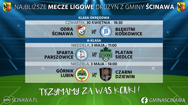 Natomiast nasze aklasowe drużyny wybiegną na boisko 3 maja. Zawodnicy Sparty Parszowice o godz. 11:00 podejmą u siebie Platan Siedlce. Tego samego dnia, nieco później, bo o 14:00, Czarni Dziewin zagrają w meczu wyjazdowym w Lubinie z Górnikiem.